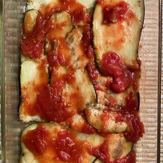6. Corta las puntas de tus berenjenas. Usando una guillotina, corta las berenjenas verticalmente en rebanadas muy finas. 7. En una refractaria mediana untada ligeramente de aceite de oliva, empieza a armar tus capas de lasagna. Pon unas rebanadas de berenjena, una al lado de la otra para la base, esparce un poco de la salsa de tomate encima y un poco de la mezcla de lentejas. Repite estos pasos para crear 4 capas, y que la quinta te quede cubierta por sólo las últimas rebanadas de berenjena. (puse fotos de estos pasos abajo por si quedas con dudas de cómo hacer las capas)